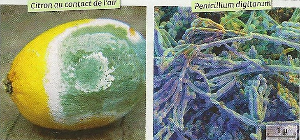 Par exemple, le champignon Penicillium digitatum, ou moisissure verte, est un micro-organisme pathogène qui provoque une moisissure verte. Il se développe sur les agrumes au contact de l'air. Ces agrumes deviennent mous, ont un mauvais goût ainsi qu’une odeur désagréable.